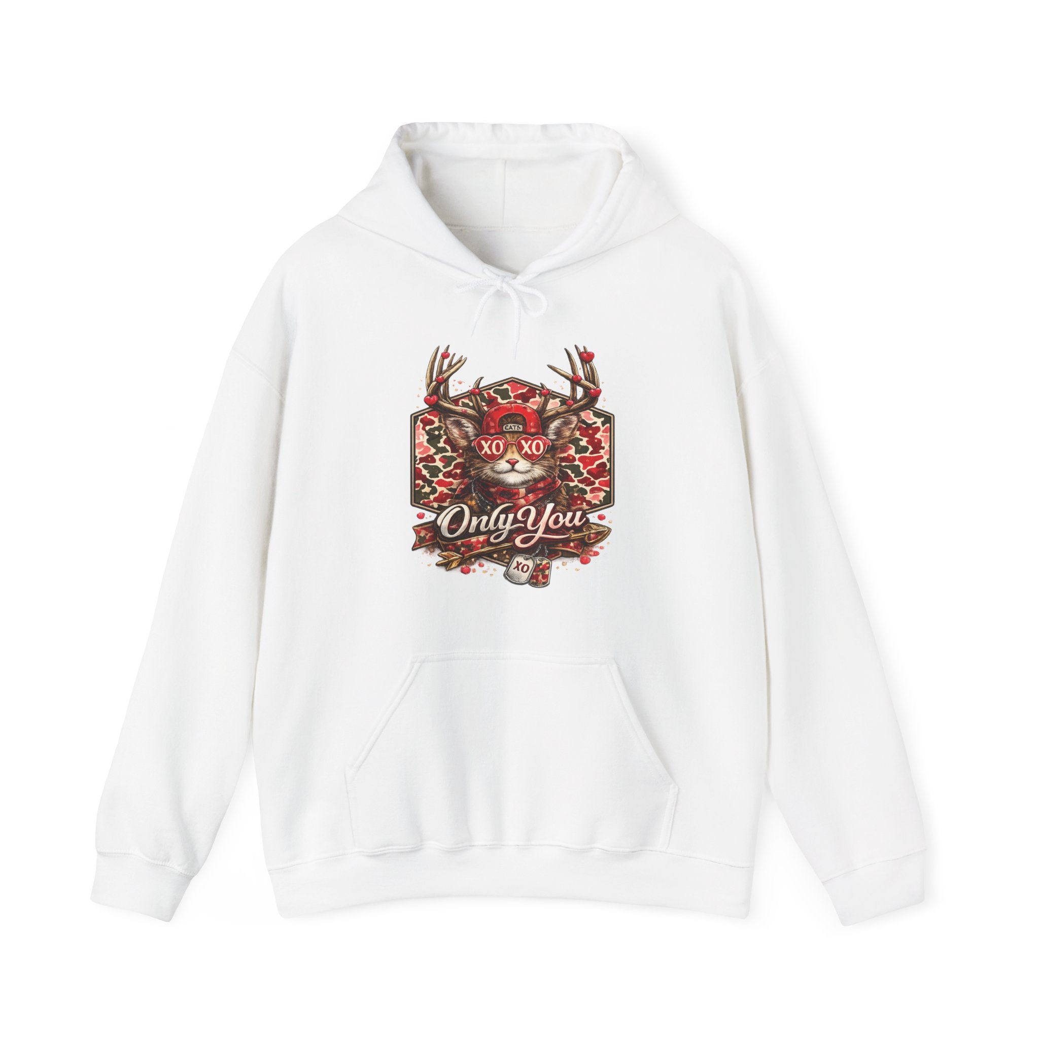 Wrap yourself in relaxed warmth and quiet charm with this heavyweight hooded sweatshirt. The design centers on a woodland-inspired crest—antlers, holly, and a subtle "Only You" script—bringing a touch of cozy, rustic romance to a clean white canvas. The roomy kangaroo pocket and double-lined hood feel like an everyday refuge on chilly mornings. Wear it on slow winter walks, by the fire after a long day, or layered for a casual date night; the sweatshirt moves with you, not against you. It’s for those who treasure small, heartfelt moments and want clothing that speaks with gentle familiarity rather than loud logos.